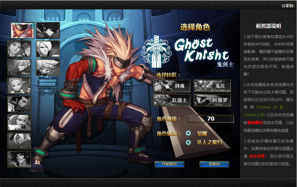 DNF70版本怀旧服,由于部分装备和增益buff对技能的MP小号、冷却时间等有影响,模拟器不能模拟您的角色的装备,所有皆能参数可能与游戏角色不符合,只作为参考!