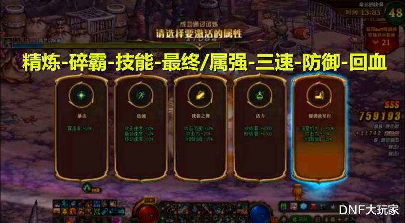 其他翻牌选项的优先顺序为:最终伤害 = 属强 > 三速 > 防御 = 回血。