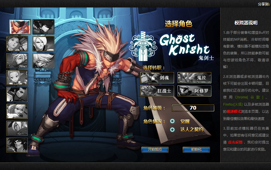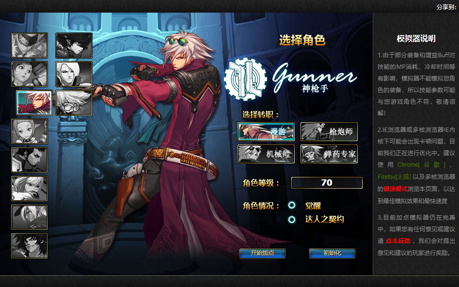 DNF70版本怀旧服,由于部分装备和增益buff对技能的MP小号、冷却时间等有影响,模拟器不能模拟您的角色的装备,所有皆能参数可能与游戏角色不符合,只作为参考!