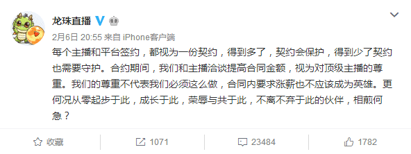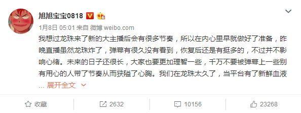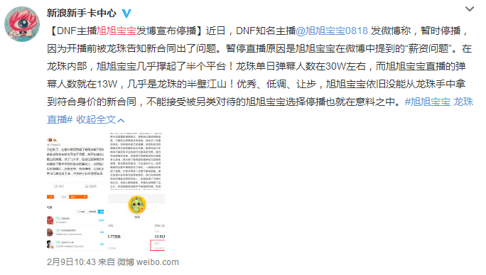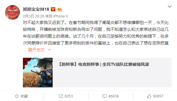 旭旭宝宝已经停播了数日,具体原因大家并不清楚。然而在2月6日晚,旭旭宝宝发布了一篇文章,解释了他停播的原因:龙珠领导曾答应给他最后一年的合约加薪,但这个决定被集团否决了,新的合同因此变得无效。