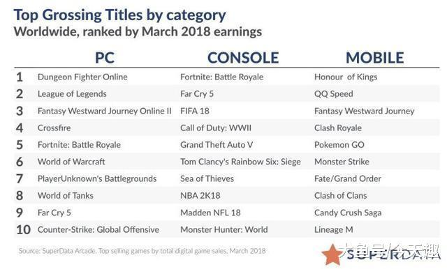 今年三月份全球游戏收入排行榜已出炉,根据美国最大数据网站superdata,DNF已成功登顶,LOL排在后方,两者皆为腾讯旗下游戏。网易游戏梦幻西游2排在了第三的位置。以下是详细排名情况: PC类游戏:DNF、LOL、梦幻西游2、CF、堡垒之夜、魔兽世界、绝地求生。 主机类游戏:堡垒之夜、孤岛惊魂5、fifa18、使命召唤14、GTA5、彩虹6号。 手机类游戏:王者荣耀、QQ飞车、梦幻西游、皇室战争、精灵宝可梦。 在排行榜中可以看到MOBA类游戏在收入上远远领先于FPS类游戏。
